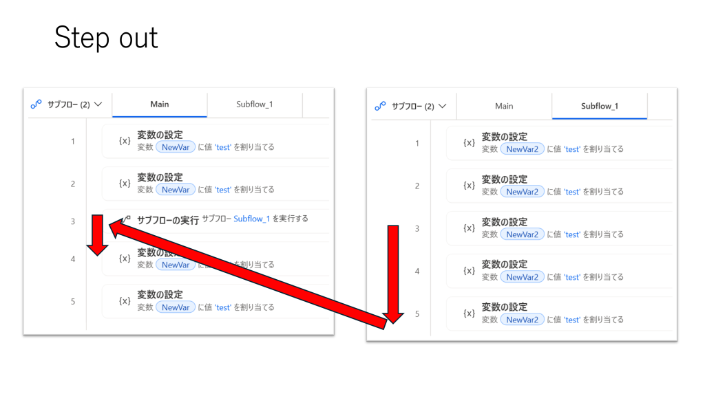 「Step out」は、今実行中のサブフローを最後までまとめて実行して、終わったら呼び出し元の次の処理に進みます。