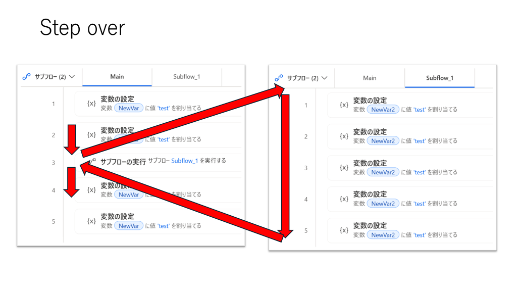 「Step over」は、サブフローを呼び出す行があれば、そのサブフローを実行してから、呼び出し元の次の処理に進みます。