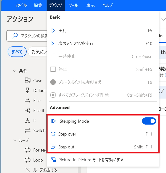 「デバッグ」メニューが「Basic」と「Advanced」に分かれ、「Advanced」に「Stepping Mode」トグル、「Step over」と「Step out」が追加されました。