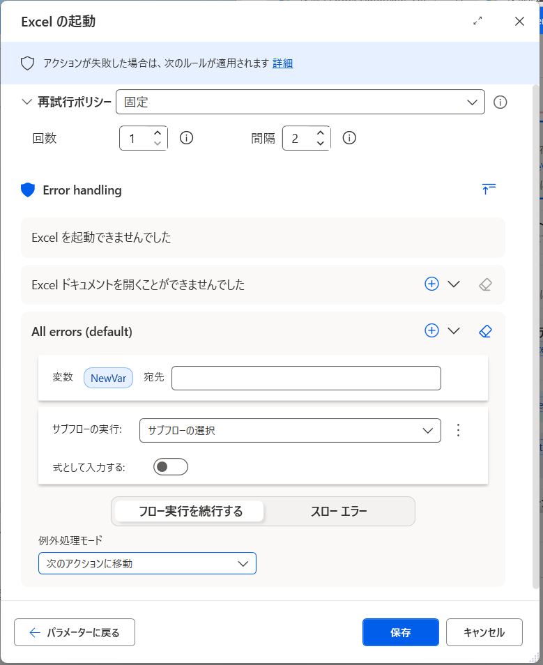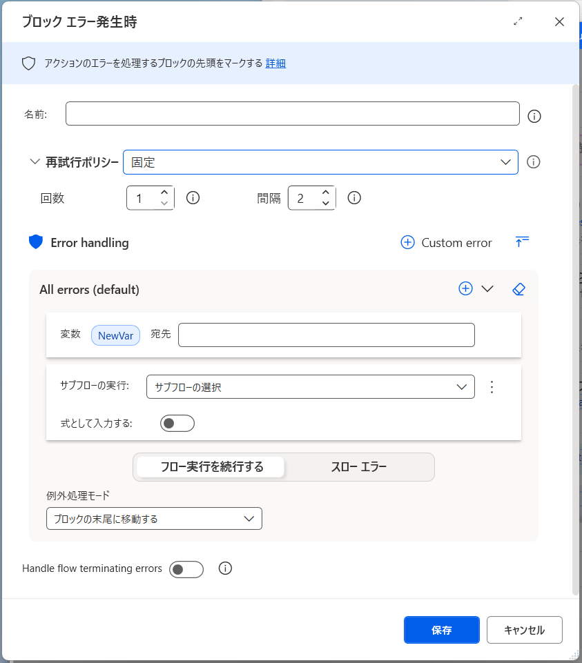「ブロック エラー発生時」アクションの設定画面