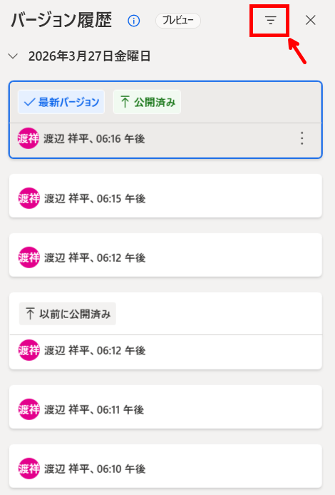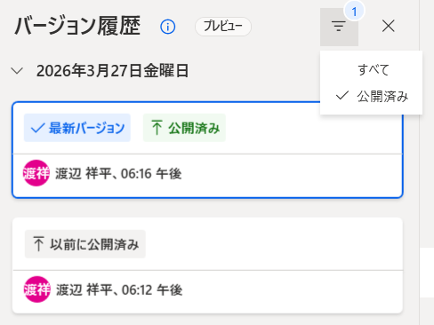 フィルター機能を利用することで、履歴から「すべて」か「公開済み」のみを表示するかを切り替えられるようになりました。